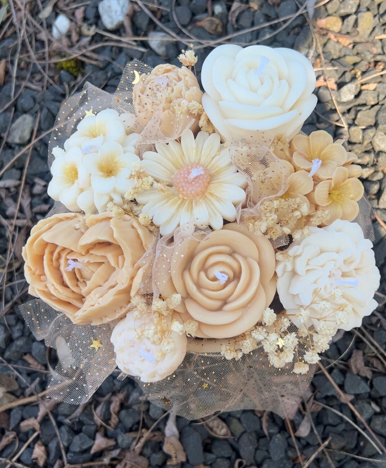 Un joli montage dans les tons beiges et blancs avec son tule pailleté et doré